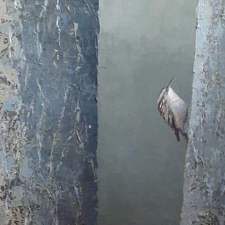 Veel van mijn schilderijen "beginnen" met één of meerdere bomen. Ik schilder graag met vergrijsde tinten. Door de grilligheid van het vloeipapier dat de basis van de boom is, is het elke keer weer een verrassing wat het eindresultaat is.